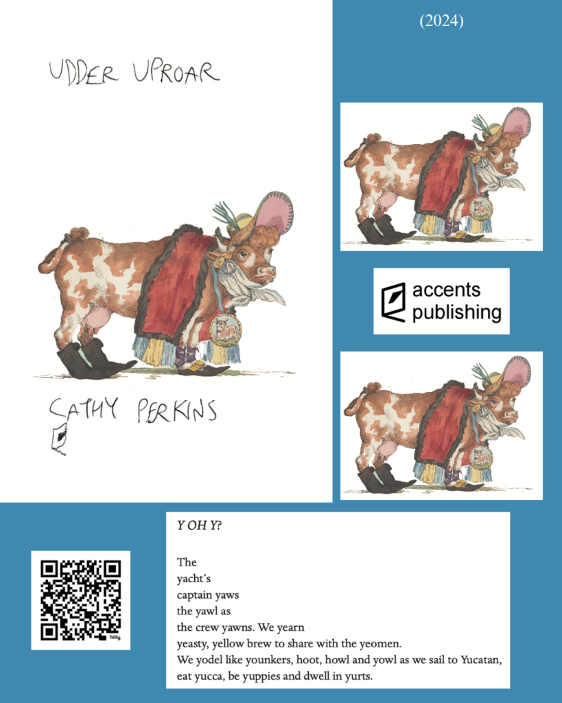 The poems in Udder Uproar reflect my thoughts and observations, full of alliteration, assonance, nonsense, humor and rhyme. These poems are just snippets of the buds blooming daily inside my world. The cherry on top (cliché) is that Katerina Stoykova, Accents Publishing owner and founder, published it, meaning what I love the most about this collection is Katerina. Her bravery to go where few dare, publishing non-traditional people (or whatever you want to call people who don’t follow “the rules”), and subject matter shows me her generosity and open-mindedness.